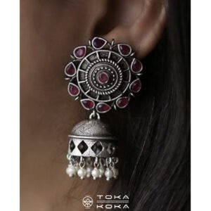 The Aruna Chakra Jhumka carries the warmth of dawn, a circle of ruby-hued stones echoing the rising sun, anchored by the gentle sway of silver bells.