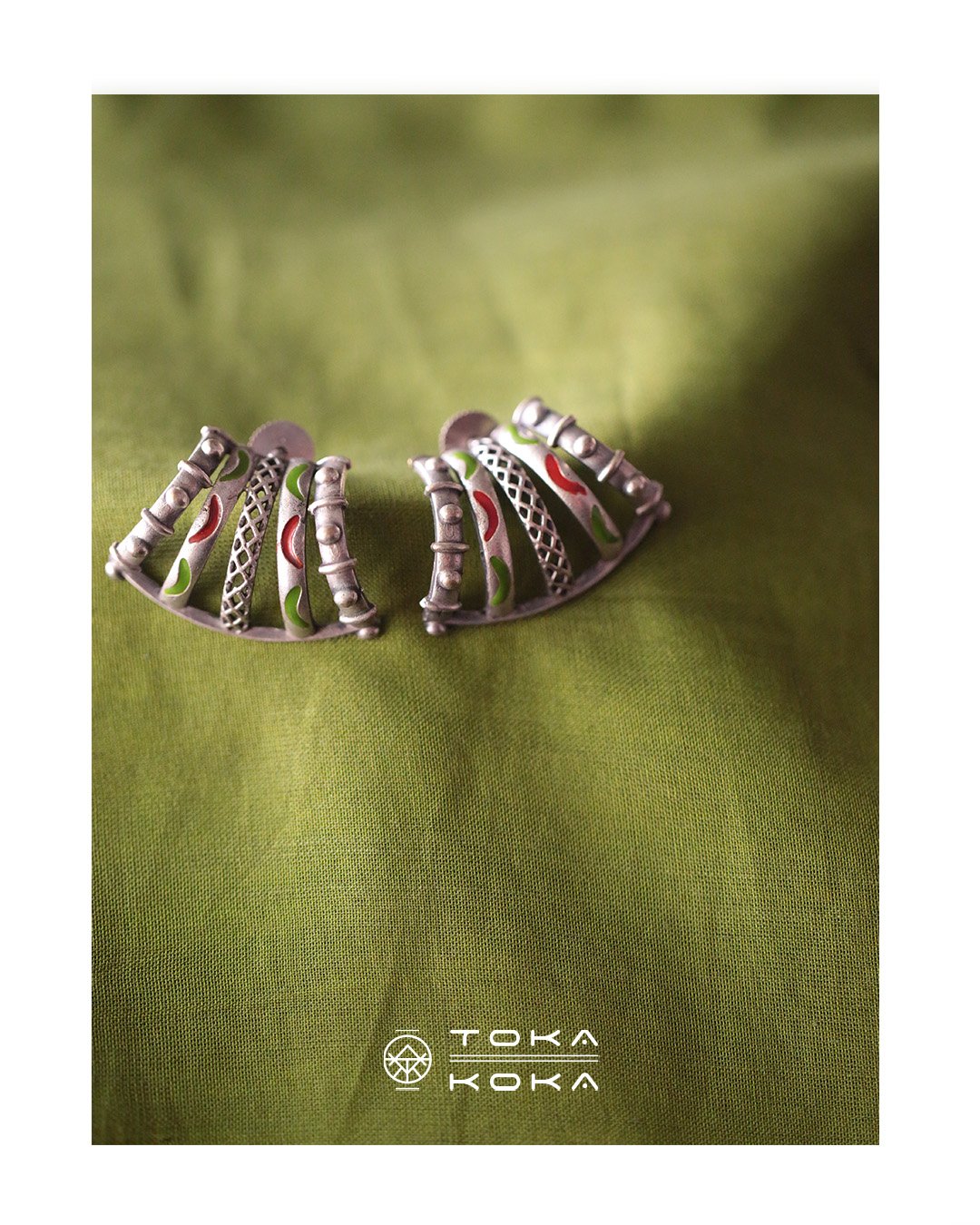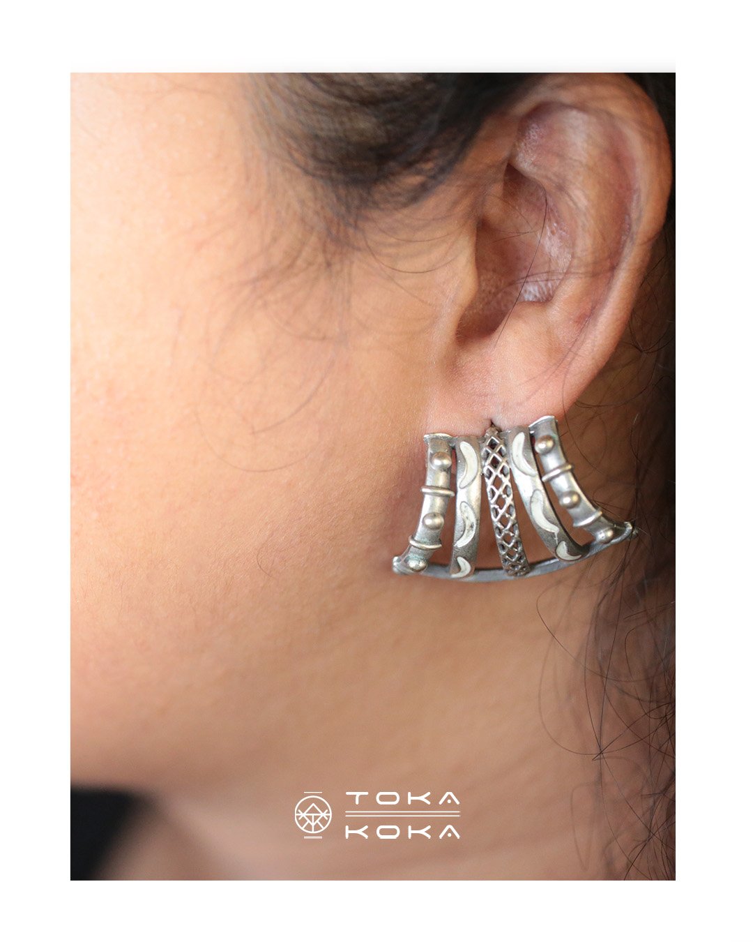 A play of arcs and ridges, Kampa sits bold yet quiet on the ear. The oxidised silver tone adds an old-soul charm, while the contours lend a modern edge. Pairs effortlessly with cottons or silks, carrying the strength of form and the grace of movement.