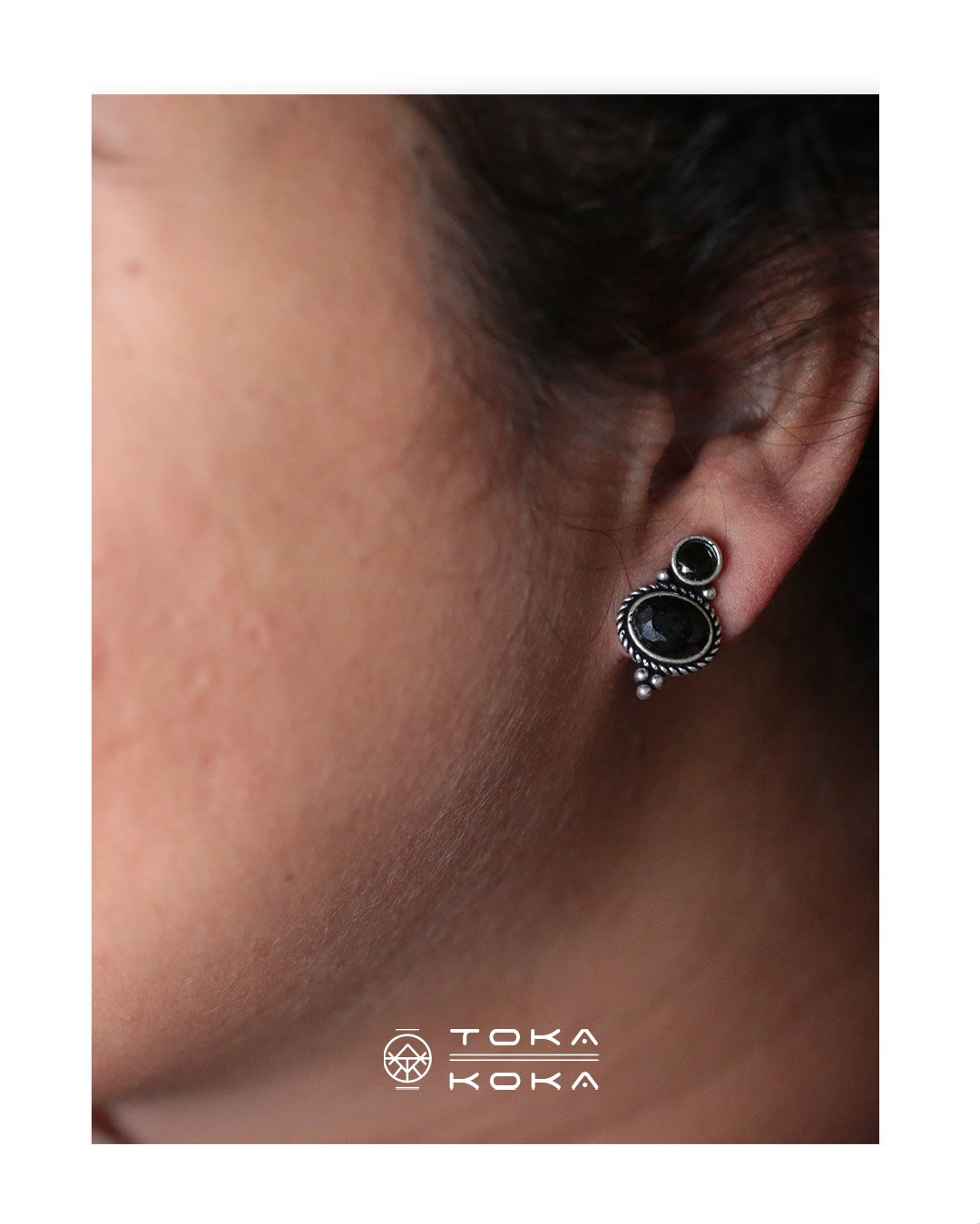 Mohana Earrings – Minimal yet striking. Faceted stones set in a silver-lookalike base with classic detailing. Available in emerald green and onyx black, they’re the perfect blend of traditional charm and everyday elegance.